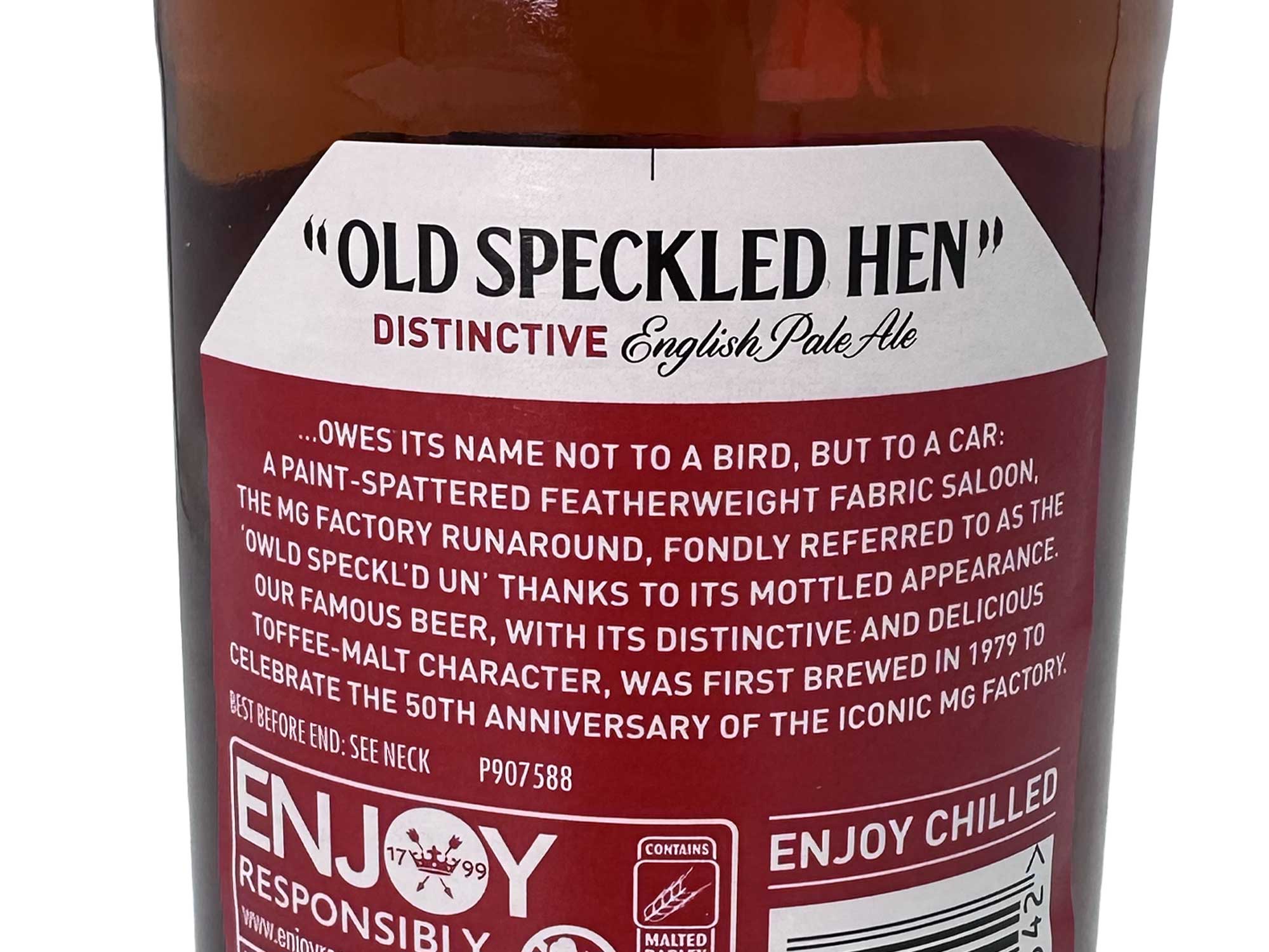 The relaunch included a new label, featuring the now so familiar red octagon borrowed from the MG logo with Old Speckled Hen script within. Aside from the reference to MG by the use of the octagon, an explanation of the tie between MG, Morland and Abingdon and the car from which the beer got its name was also included on the back of the packaging, for the sake of MG enthusiasts, lovers of very English tales and others of curious mind.