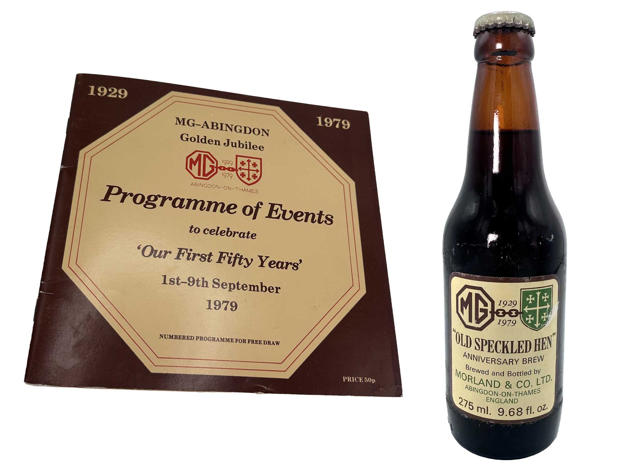 Employees of MG entered a competition to design a label for the Old Speckled Hen beer pump handles and beer bottles, the winning design featuring the MG octagon logo, linked by a chain to the Abingdon coat of arms, with the MG aspects of the label in MG’s traditional brown and cream and the Abingdon and Morland aspects in the green of the town’s coat of arms.